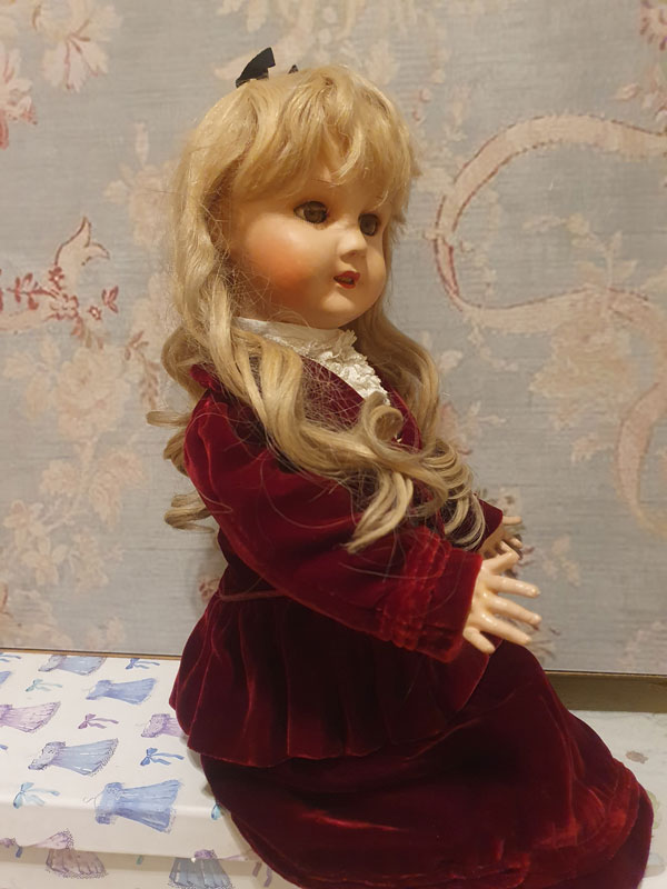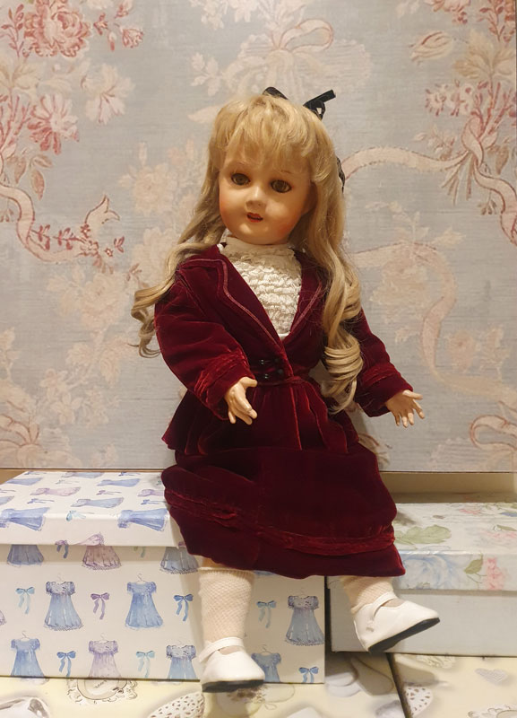 Vestida con un hermoso conjunto de terciopelo y pechillo de encaje a juego, posiblemente original. Lleva sus calcetines y zapatitos blancos a juego.