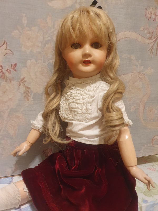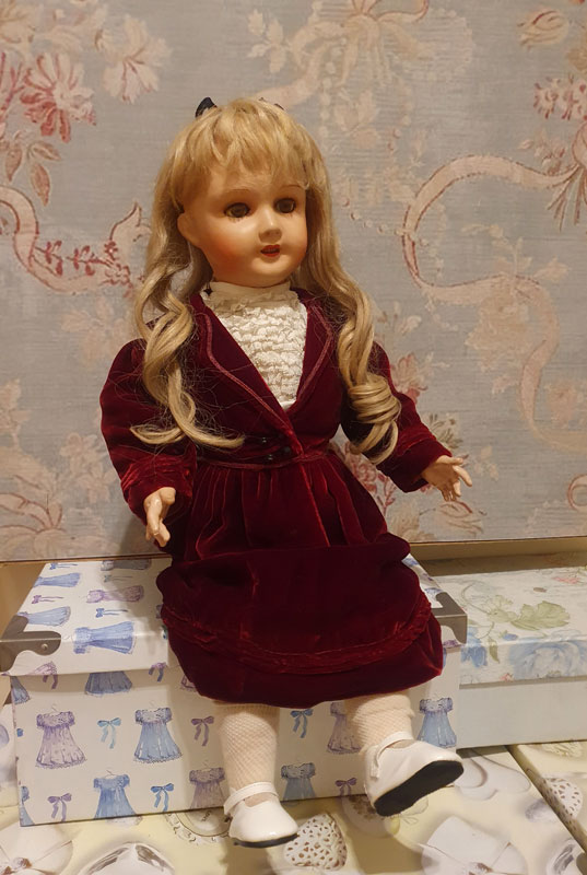 Vestida con un hermoso conjunto de terciopelo y pechillo de encaje a juego, posiblemente original. Lleva sus calcetines y zapatitos blancos a juego.