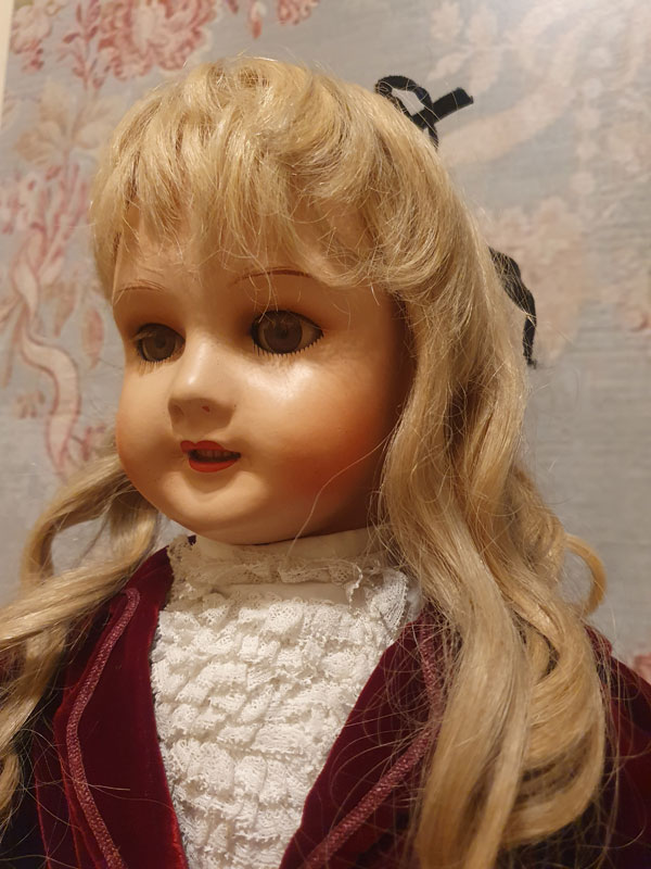 Ella tiene sus grandes ojos de cristal con todas sus pestañas, boquita abierta y peluca original natural.